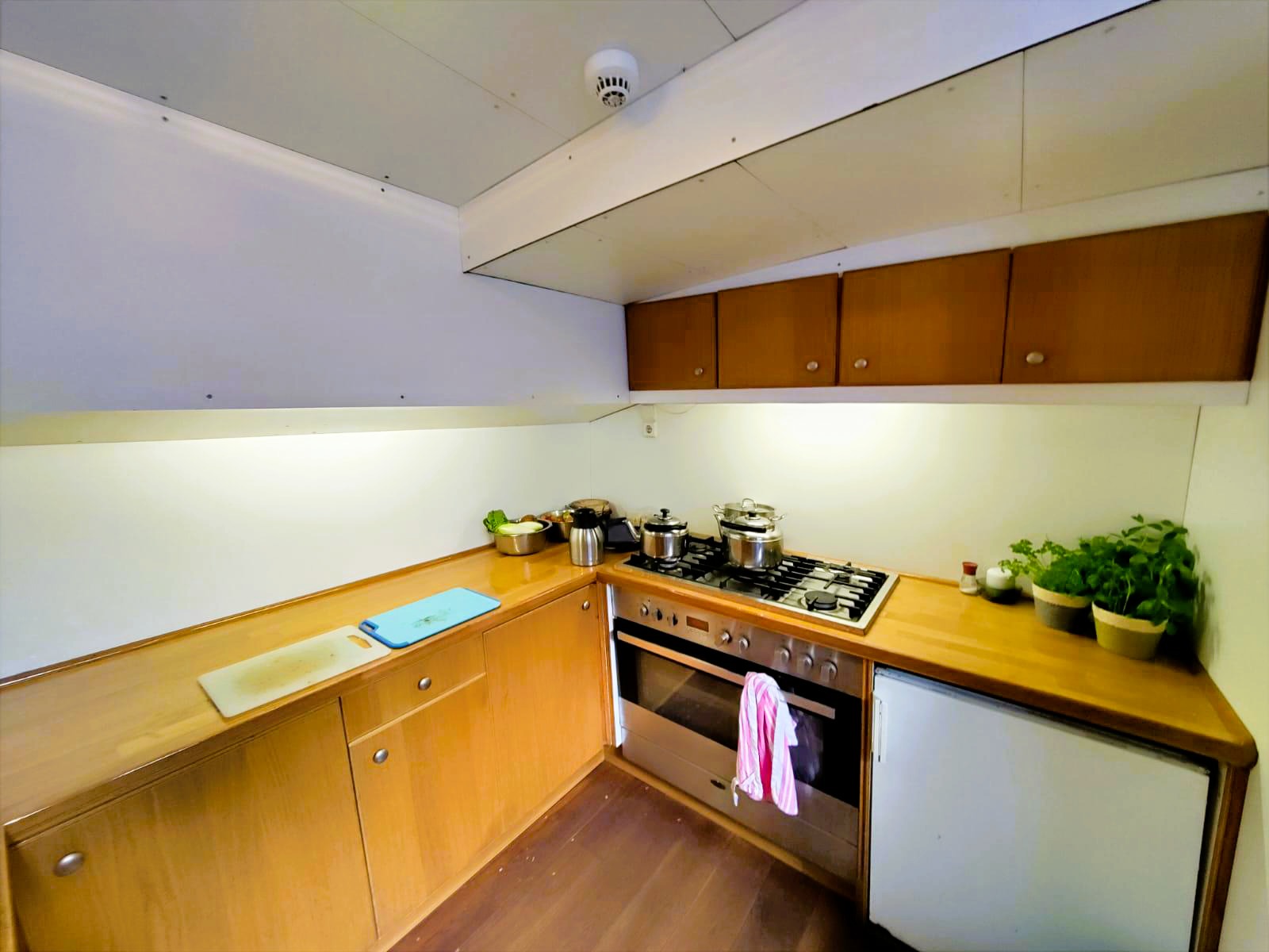 Über eine breite Treppe gelangt man direkt in die segelnde Ferienwohnung. Da erwartet Sie eine offene und voll ausgestattete Küche mit einem Gasherd, einem Backofen und einem Kühlschrank.